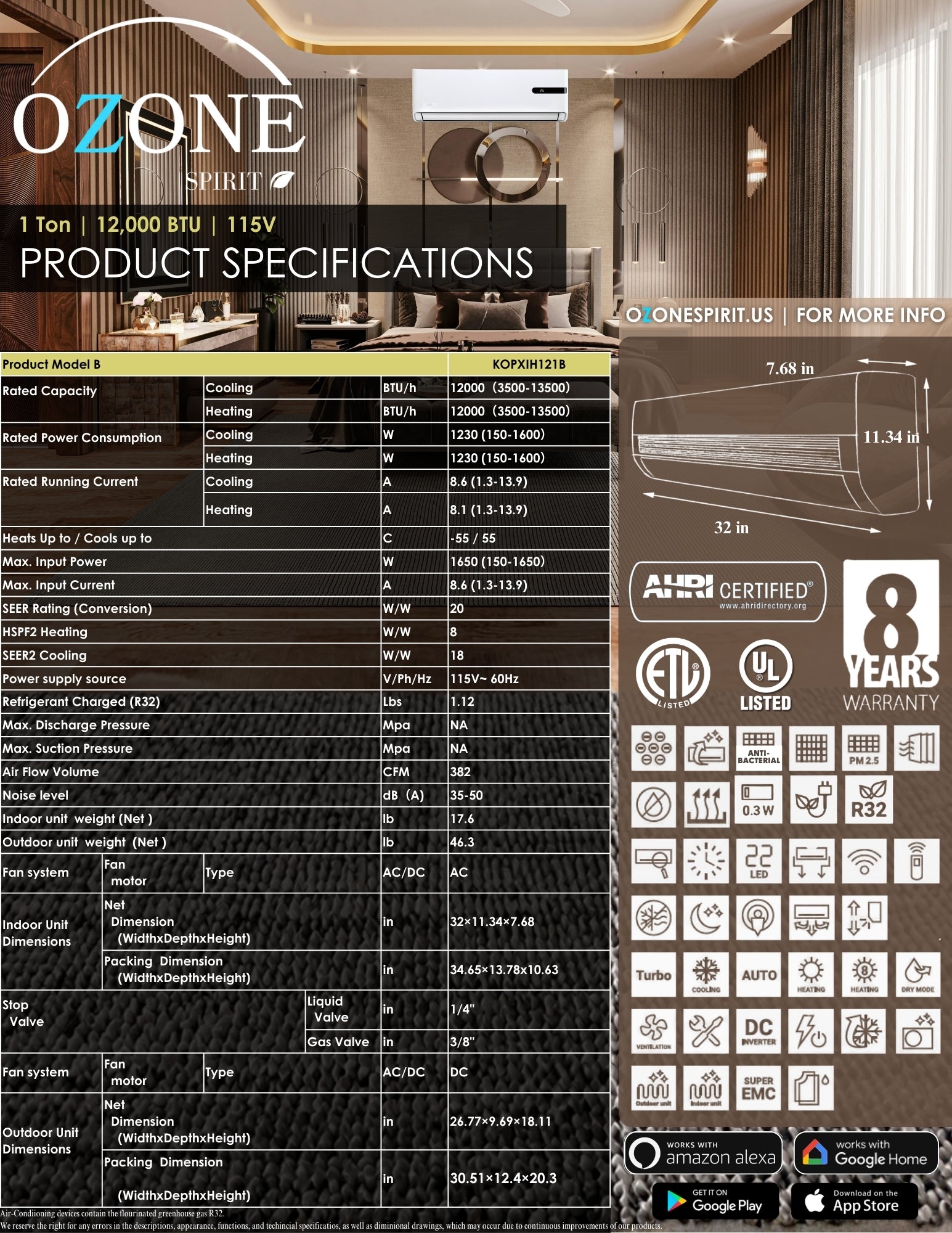 Go green with the Ozone Super Eco 12k BTU Mini Split, featuring 18.2 SEER2 cooling and 8.2 HSPF2 heating in a 1-ton 110V design. Its Wi-Fi Yellow inverter saves energy while providing cooling and heat for small spaces. AHRI & ETL certified—shop now for eco-friendly comfort with Summer '26 discounts!
