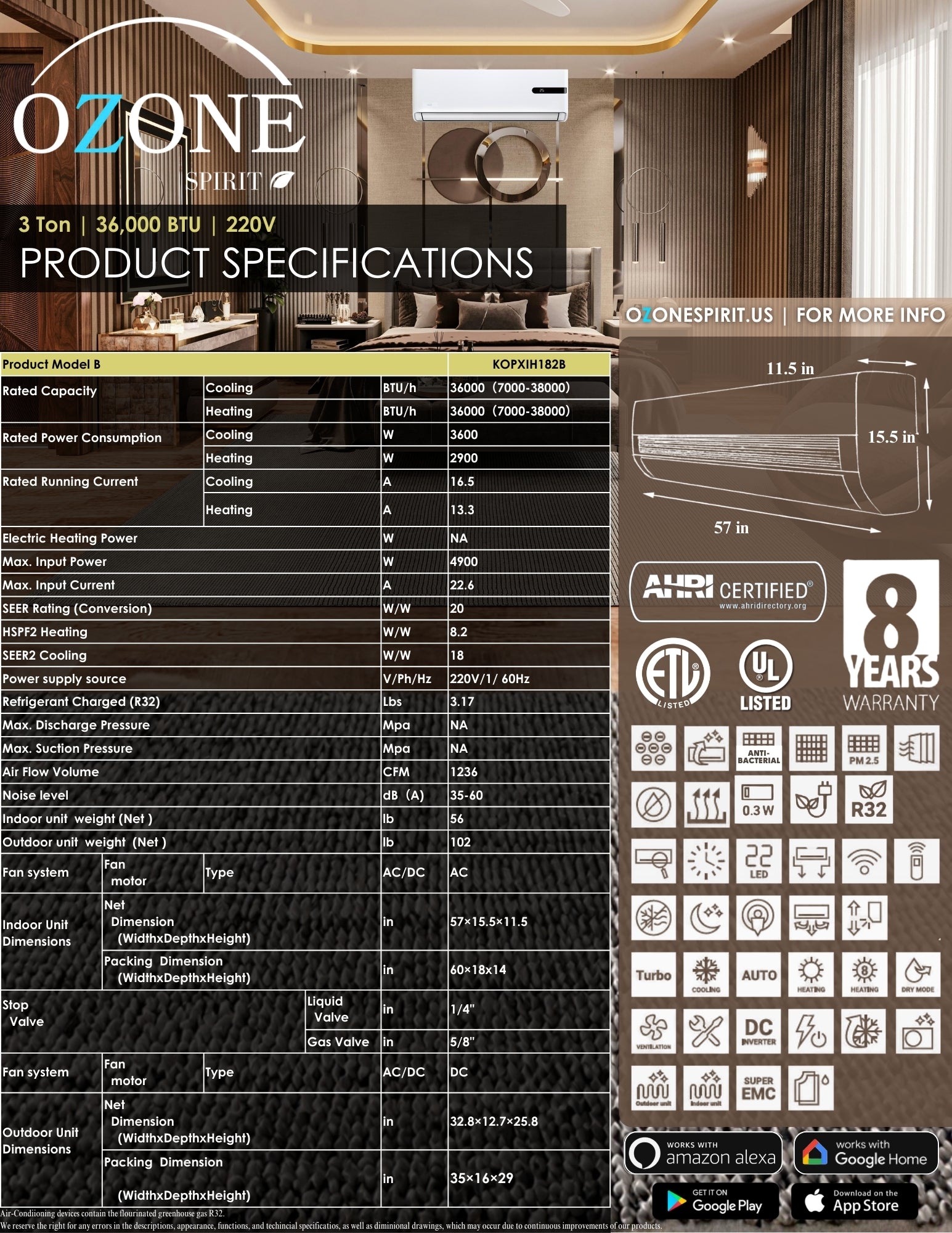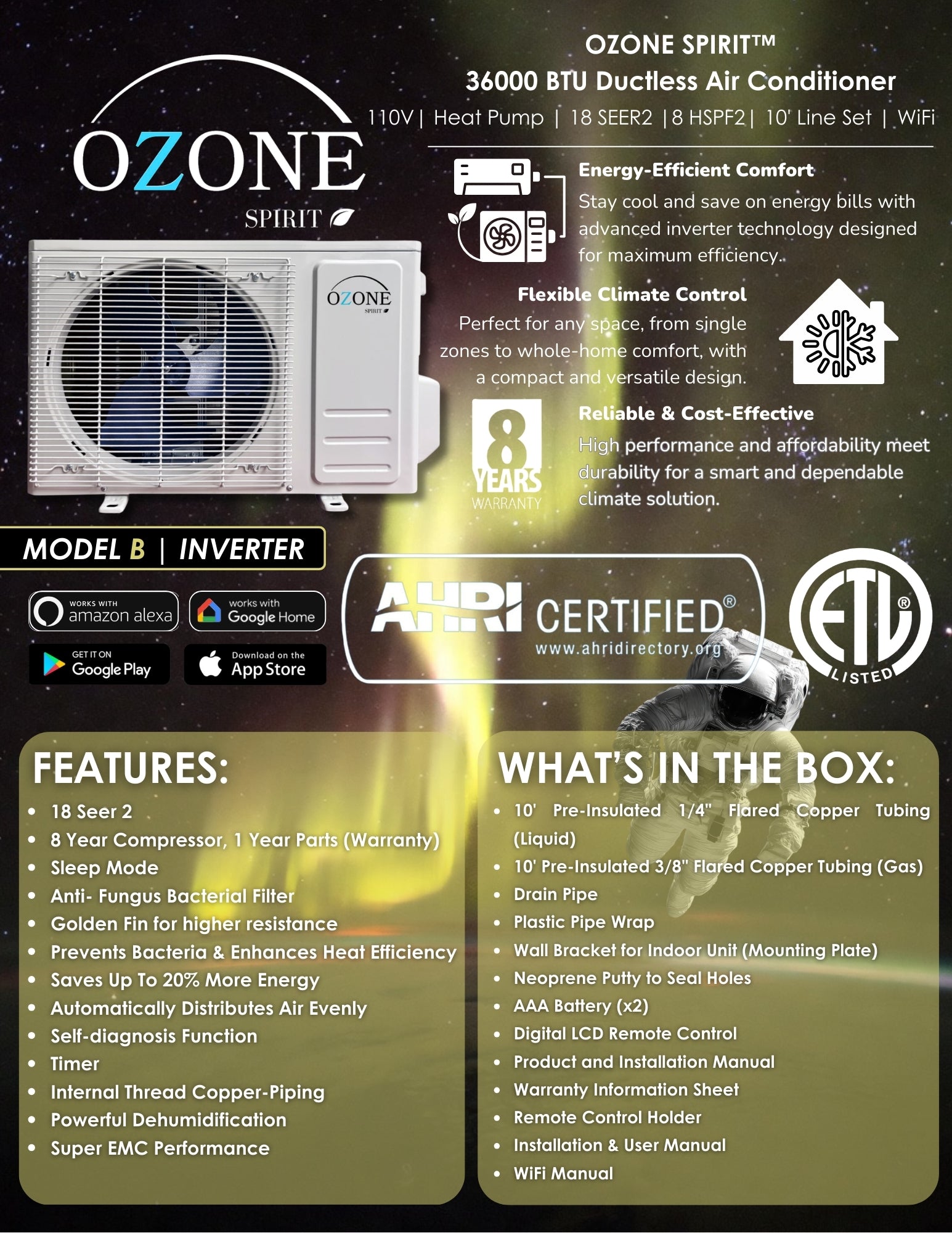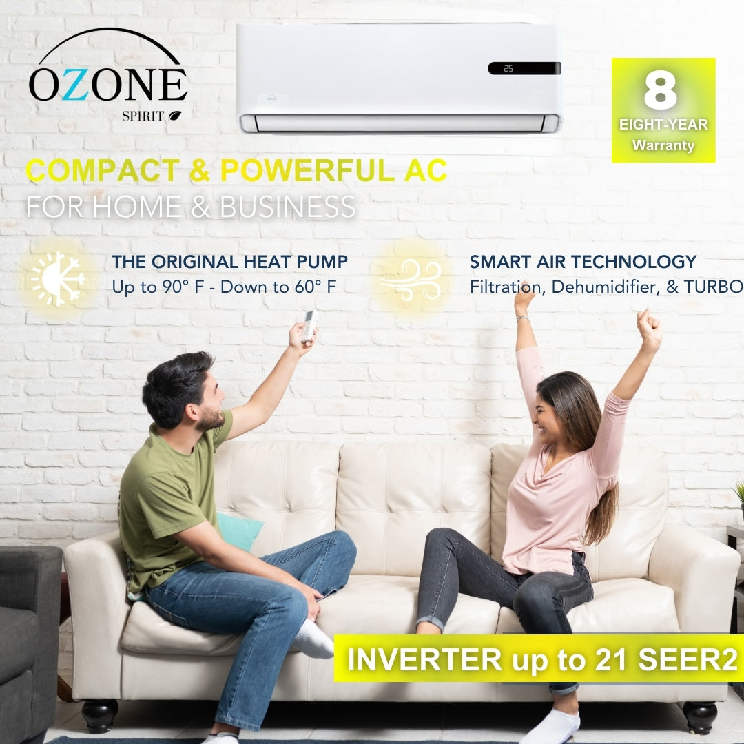 Go green with the Ozone Super Eco 36k BTU Mini Split, featuring 18.2 SEER2 cooling and 8.2 HSPF2 heating in a 3-ton 220V design. Its Wi-Fi Yellow inverter saves energy while providing cooling and heat for small spaces. AHRI & ETL certified—shop now for eco-friendly comfort with Summer '26 discounts!