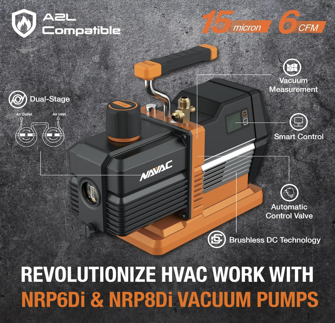 The NAVAC NRP6Di Smart Vacuum Pump ushers in a new era of HVAC maintenance with intelligent inverter-driven performance and precision monitoring. This brushless DC-powered unit combines vacuum measurement, smart controls, and high-efficiency evacuation in one lightweight design, ideal for HVAC/R systems, automotive, leak detection, and industrial applications. A2L refrigerant compatible, it ensures compliance and safety while delivering deep vacuums effortlessly.